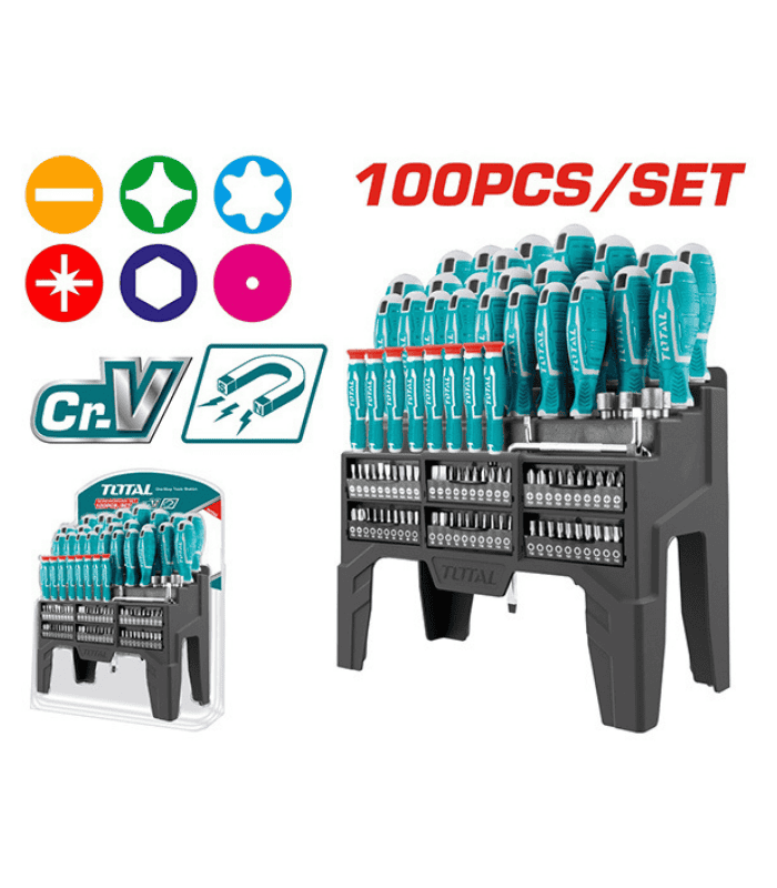 TOTAL set odvijača 100 dijelova omogućava profesionalne rezultate bez potrebe za kupovinom dodatnih bitova i nastavaka, jer sadrži kritične komponente za različite primjene i vrste vijaka.