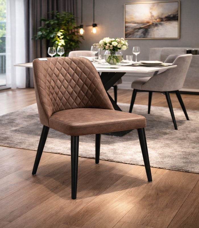 Ova moderna trpezarijska stolica ističe se sofisticiranim dizajnom i pažljivo izrađenim detaljima. Presvlaka u toploj braon nijansi sa dekorativnim dijamantnim prošivom na naslonu daje prostoru dozu elegancije i luksuza.