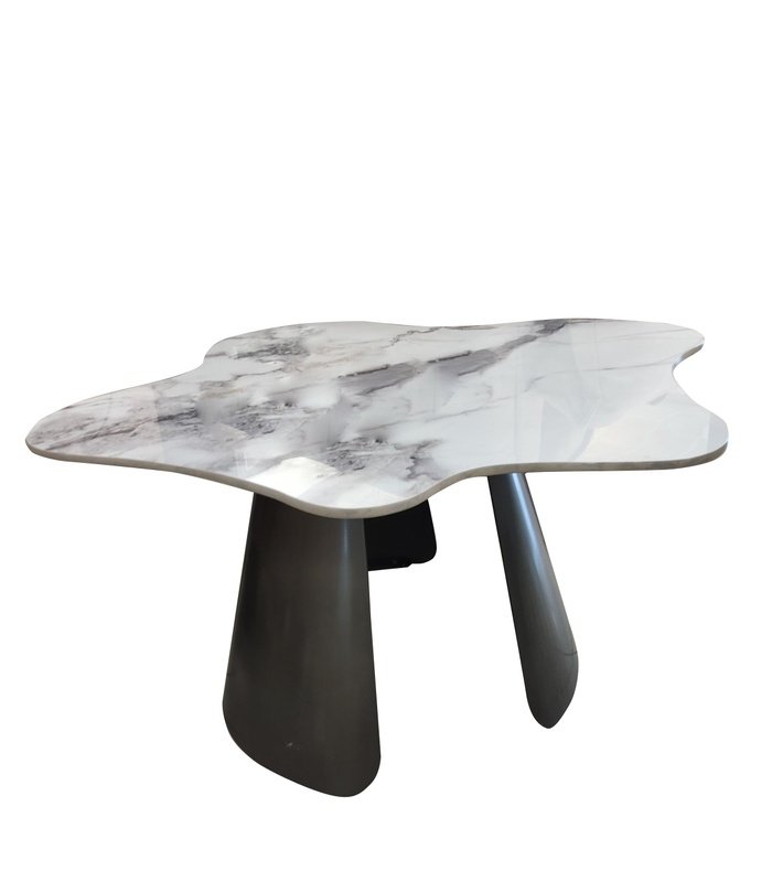 Ovaj savremeni trpezarijski sto kombinuje sofisticiranu sivu ploču sa efektom prirodnog kamena i stabilne crne, koso postavljene noge koje mu daju moderan i elegantan karakter. Zaobljene ivice doprinose vizuelnoj mekoći i sigurnosti, dok čvrsta konstrukcija garantuje dugotrajnost i stabilnost pri svakodnevnoj upotrebi.